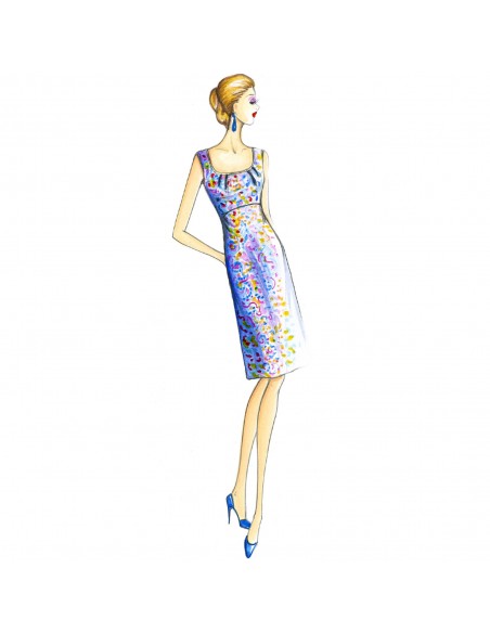 Semi-fitted, slightly flared sheath dress with empire cut. Jacket n. 6956.
