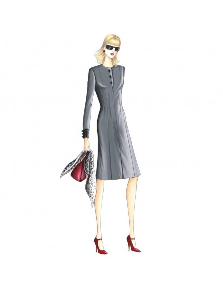 This sheath dress has a dart motif toward the outside that shapes the waistline. Suggested fabric: jersey or wool crêpe. Coat no. 9624.