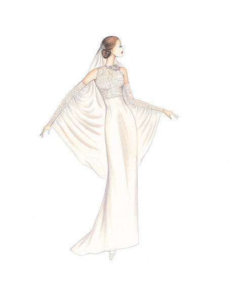 Geradliniges Kleid mit Meerjungfrauen-Schleppe im hinteren Teil des Rocks, mit Spitze überzogenes Empire-Mieder mit Ärmelumschlag im amerikanischen Stil. Original Chiffon Schleier in Spitze oder Stretch-Stoff Handschuh eingefügt.