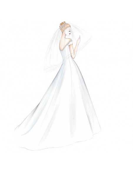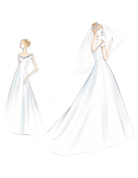 Der breite Ausschnitt dieses kurzärmeligen Prinzessinnenkleides, das am Rücken in ein V ausläuft, ist mit Spitze eingefasst. Empfohlener Stoff: Mikado, Gazar oder Duchess-Satin.