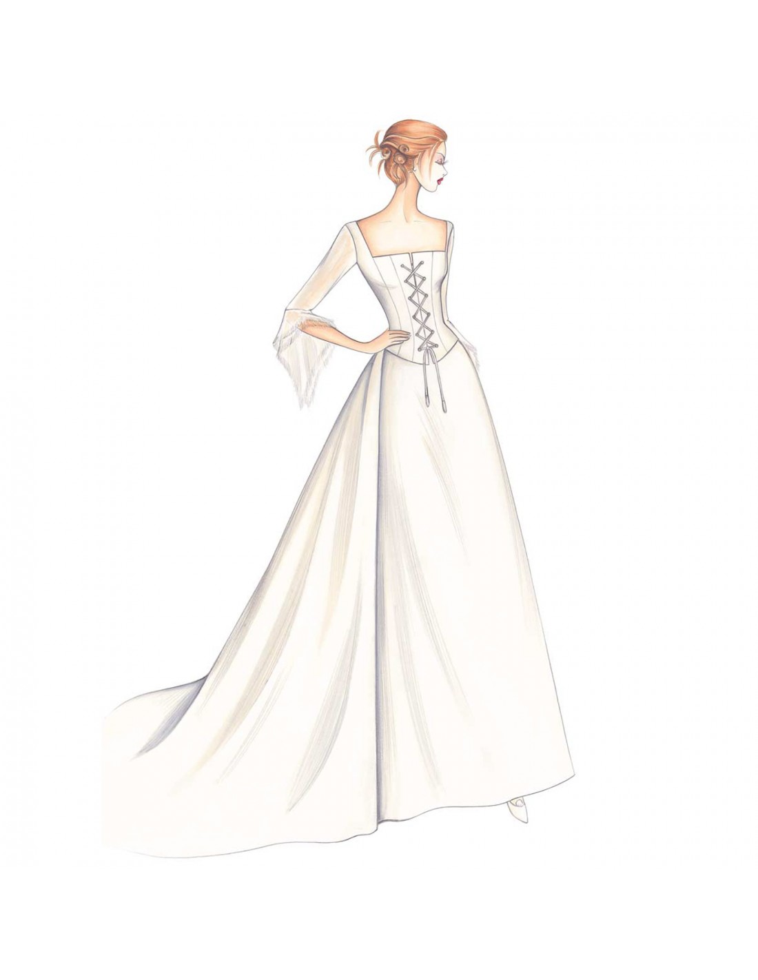 Atmosphäre des achtzehnten Jahrhunderts für diese figurbetonte, korsettartige Jacke mit Schnüren geschlossen, mit quadratischem Ausschnitt und Chiffon-Ärmeln mit mit doppelten, abgerundeten Volants an den Manschetten, deren spitzer Saum ausgefranst werden kann. Der schlichte, ausgestellte Rock ist im Rücken gerafft und geht in eine Schleppe übergeht. Empfohlener Stoff: Taft oder Ratzmir.