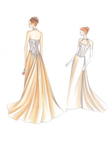 Das Korsett im amerikanischen Stil ist aus besticktem Tüll oder Chantilly-Spitze gefertigt. Es ist unten abgerundet und wird am Rücken mit einer Schnur geschlossen. Der halbgerade Rock, der am Rücken gerafft ist und in eine Schleppe mündet, ist aus Organza oder Taft.