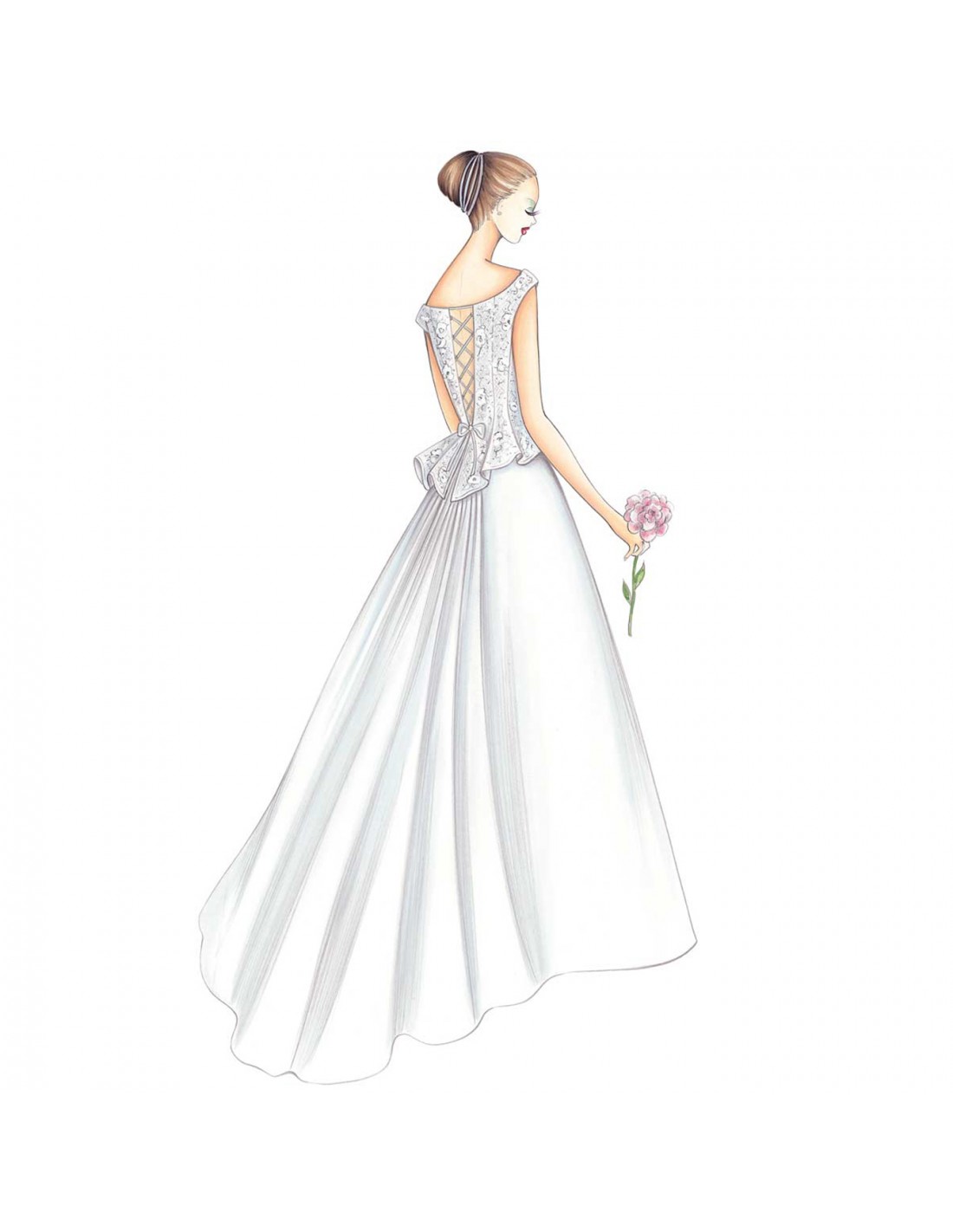 Dieses raffinierte, elegante Outfit hat ein Korsett-Oberteil, das die Schultern freilässt Schultern freilässt und mit Schnüren in einem V geschlossen wird; unten öffnen sich weiche fließenden Schößchen, das am Rücken abfällt. Der ausgestellte Rock hat eine erhöhte Einsatz in der Taille. Empfohlener Stoff: Alençon-Spitze und Organza oder Taft.