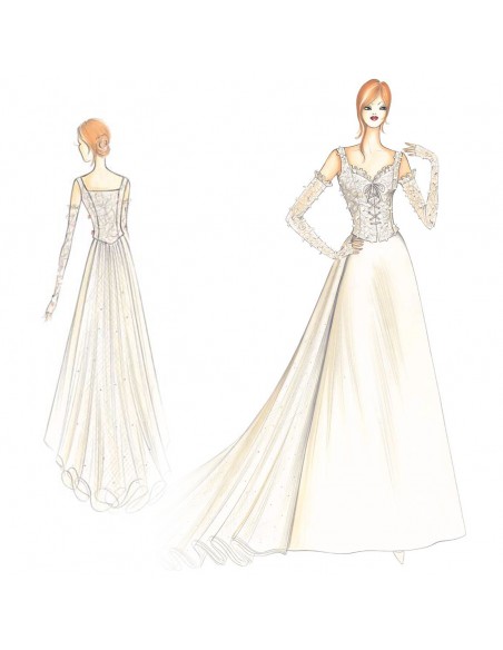 Kräftige Tüllrüschen betonen den herzförmigen Ausschnitt und die auf halber Handfläche abgeschnittenen Handschuhe auf halber Handfläche dieses Outfits. Es hat ein mit Netz besticktes Tüllkorsett und einen ausgestellter Taftrock in Lagen mit einer reichen, runden Tüllschleppe, die an der Taille.