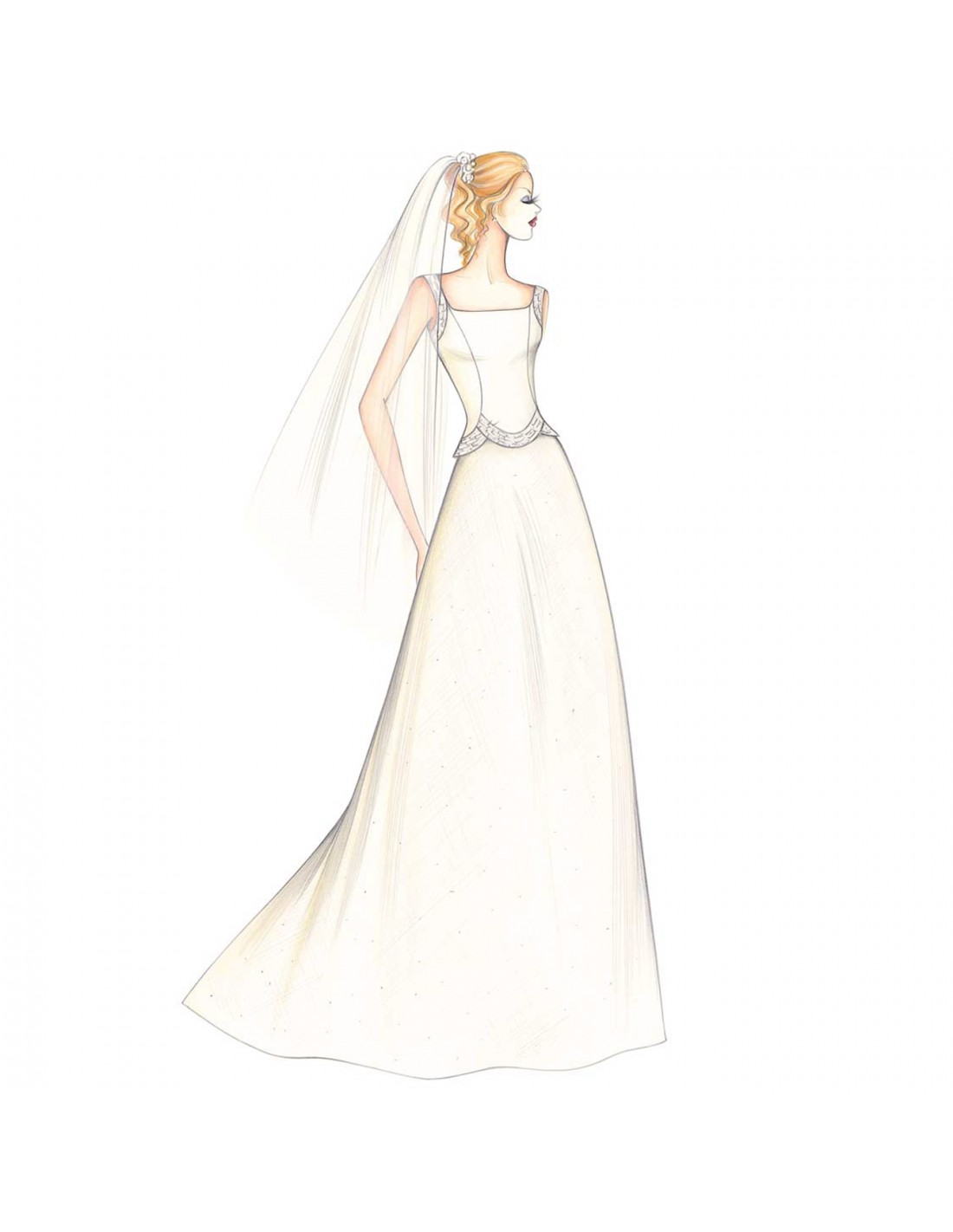 Dies ist ein sehr raffiniertes Outfit. Das eng anliegende Korsett ist mit Kristallstickereien an den Schultern und entlang der gekreuzten Wellen, die am Rücken in offenen Spitzen am Rücken. Der ausgestellte Rock geht in eine leichte Schleppe über. Vorgeschlagene Stoff: Mikado, Gazar oder Organza.