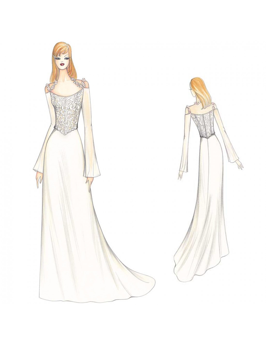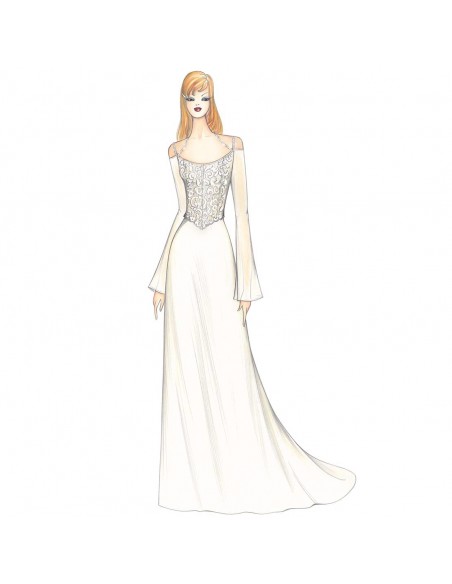Florale Schulterbänder schmücken die nackten Schultern dieses zweiteiligen Kleides. Das Korsett läuft in der Taille spitz zu und hat an den Ärmeln ausgestellte Manschetten. Der Rock geht in eine Schleppe über. Empfohlener Stoff: Makramee-Spitze für das Korsett, Charmeuse-Satin und Chiffon für den Rock.