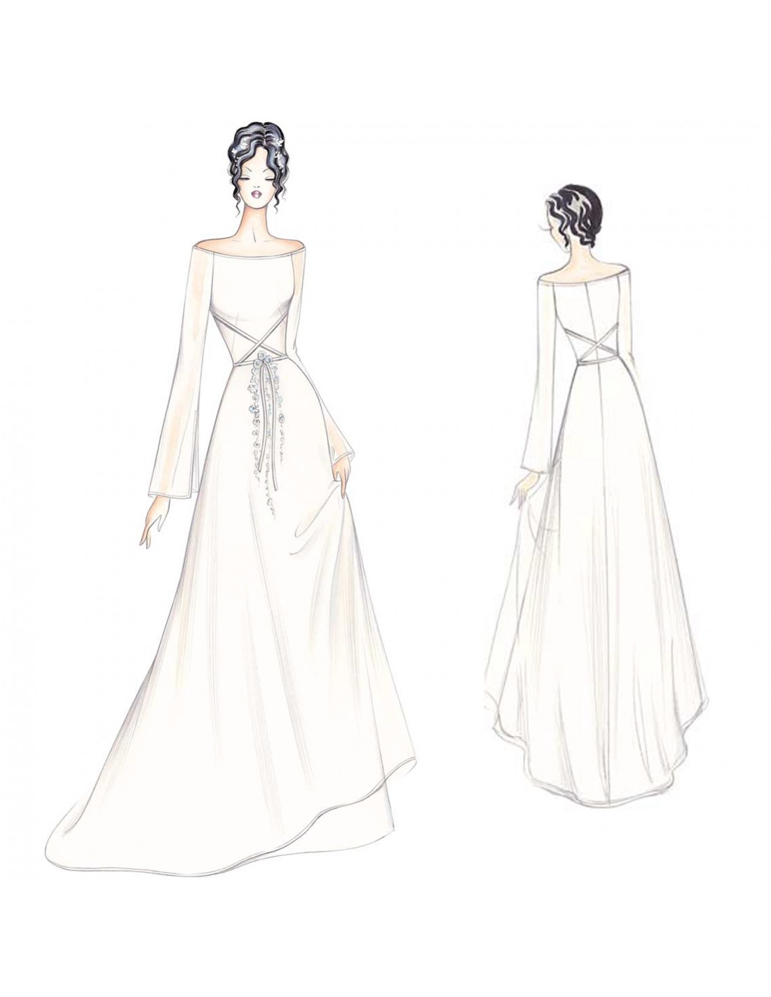 Dieses raffinierte Kleid hat ein figurbetontes Mieder, das die Schultern freilässt und Ärmel, die an den Manschetten ausgestellt sind. Der weit ausgestellte Rock ist einfach und hat eine Schleppe. Empfohlener Stoff: Dreifach-Organza, überlagert mit extrem leichtem Organza. Kann auch mit einer Kaskade von kleinen applizierten Blumen oder mit gekreuzten Schnüren in der Taille.