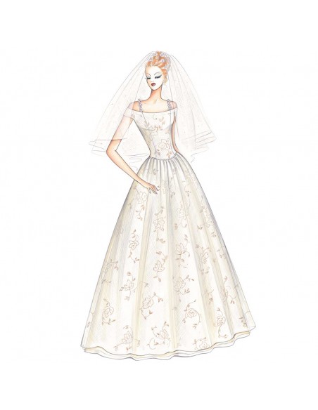 Dieses Kleid hat ein Korsett, das die Schultern freilässt und mit geblümten Trägern geschlossen wird, und einen weiten, gerafften Rock aus auf der Faser geschnittenem Stoff. Empfohlener Stoff: zarte Spitze oder Tull.