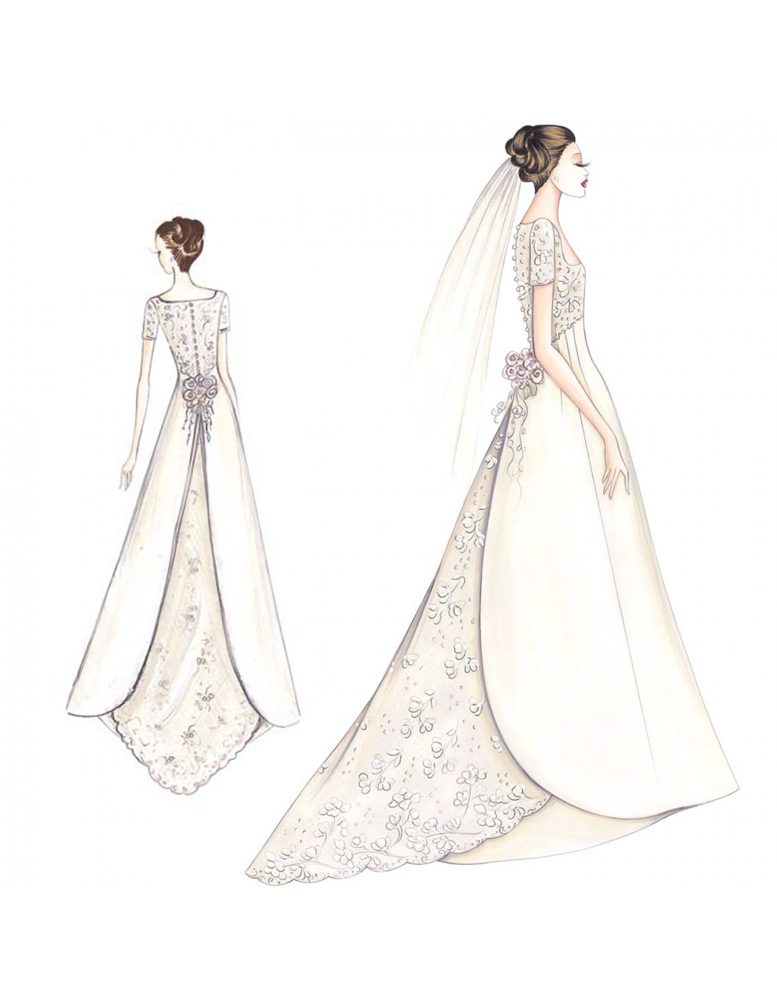 Dieses elegante, romantische Kleid hat einen breiten Rundhalsausschnitt mit kurzen Ärmeln und einem gewölbten Empire-Schnitt, der am Rücken in ein V fällt. Der weite Rock hat 3 Lagen, die sich vorne überkreuzen und am hinteren Ausschnitt abgerundet sind um einen Blick auf die Schleppe freizugeben. Empfohlener Stoff: Mikado oder Gazar und Alençon-Spitze.