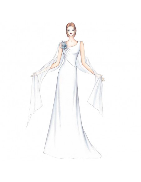 Eine Rose hält die weiche Drapierung am Rundhalsausschnitt dieses Kleides mit schrägem Schnitt und ausgestelltem Rockteil. Empfohlener Stoff: Cady, Charmeuse-Satin oder Chiffon.
