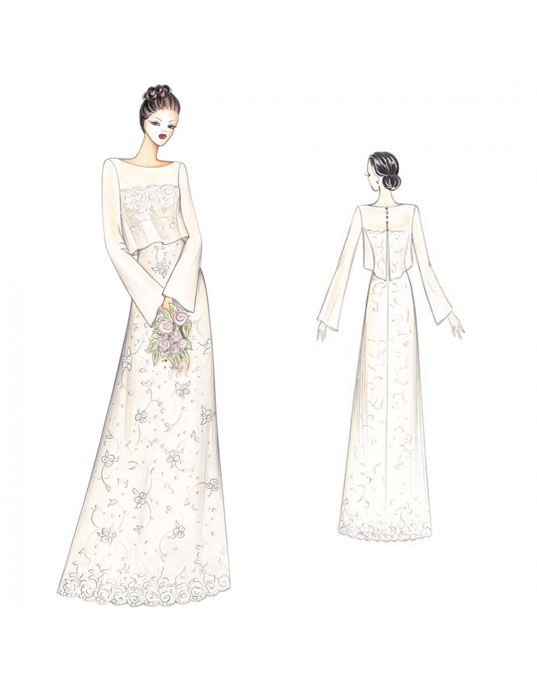 Dieses tief ausgeschnittene Kleid mit Empire-Taille hat ein eng anliegendes Mieder, das nach unten hin offen unten offen. Das Bolero-Schulterband fällt am Rücken herab und öffnet sich in der der Mitte. Das Kleid hat einen Bootsausschnitt und ausgestellte Ärmel. Empfohlener Stoff: Chantilly-Spitze für das Kleid, flüchtiger Chiffon für den Schulterumhang.
