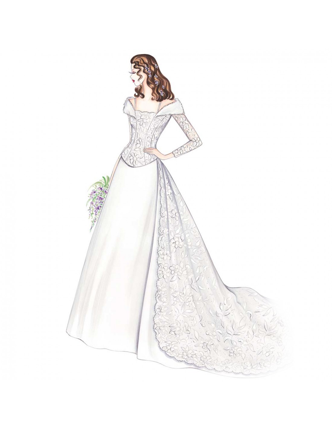 Dieses wichtige, romantische zweiteilige Outfit hat ein Korsett mit abgerundetem Schnitt das in den schalartigen Kragen übergeht, der die Schultern einrahmt. Es hat dünne Träger und handschuhartige 3/4-Ärmel. Der ausgestellte Rock hat eine lange, breite Schleppe die durch Falten aufgelockert wird. Die Schleppe kann abnehmbar gemacht werden. Empfohlener Stoff: Mikado mit Alençon- oder Chantilly-Spitze oder einfacher Samt mit Pelz- oder satiniertem Kragen.