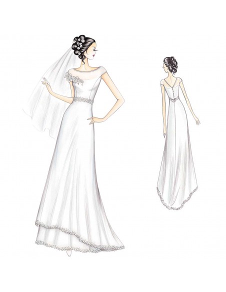 This refined empire-waist gown has a boat neckline and sleeves that droop slightly off the shoulders. The flared skirt is doubled and edged with lace or embroidery. Suggested fabric: cady or light organza.