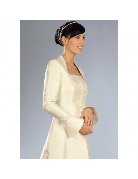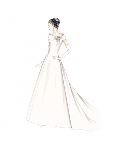 Elegant und fürstlich, langer Redingote Bord-an-Bord mit am Ende sich ausweitendem herzförmigen Tuch , der die Spitze des Kleids durchscheinen lässt, mit geschlitztem Volant-Unterärmel. Empfohlen in Mikado. Ein Einsatz aus Spitze verschönert das Dekolleté im Prinzessinnen-Kleid ohne Ärmel mit quadratischem Ausschnitt, ausführbar in Mikado.