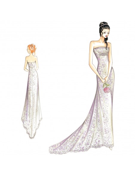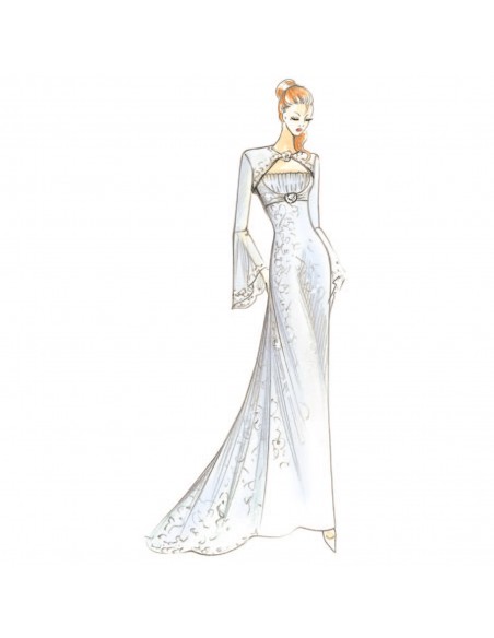 In Spitze Chantilly und Chiffon auszuführendes Kleid mit modellierter Linie, die sich zum Ende öffnet, dichte vertikale Drapierung längs des Dekolleté mit Umrahmung durch drapierte Schärpe mit Schnalle auf dem Empire-Schnitt. Der Rundausschnitt lässt eine Öffnung auf dem Dekolleté und hat Ärmel mit weitem, vom Ellenbogen ausgehenden Volant. Kombinierbar mit Schulterumhang 0138.