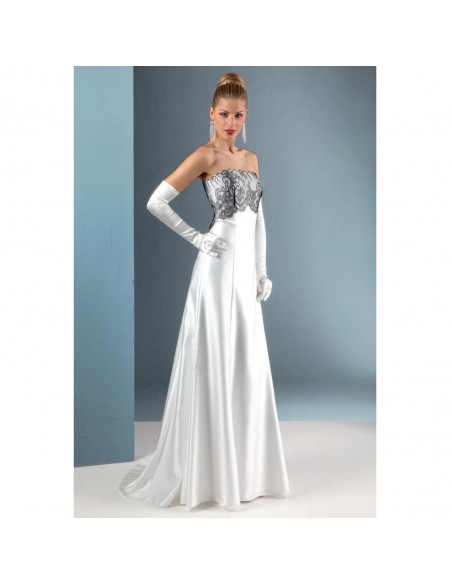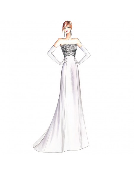 Raffiniert im Rock ist das Dekolleté-Kleid, verschönert durch Kontrastspitze, unterteilt in Tücher, die eine Kalla-Linie erzeugen und die Silhouette betonen. Ausführbar in Mikado, Duchesse-Satin, Gazar oder Dreifach-Organza-Stoff mit Einfassung in Chantilly-Spitze oder bestickt in Perlen, Strass oder Steinen.