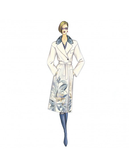 Dieser geradlinige Mantel mit Trenchcoat hat einen doppelten Überschlag, der in der Taille mit einem einzigen Knopf und Gürtel geschlossen wird. Er hat einen sportlichen Kragen, Ärmel mit tiefen, runden Armlöchern und eine spitze Passe auf dem Rücken. Empfohlener Stoff: Kaschmir, Gabardine, Lederimitat oder Wildleder.