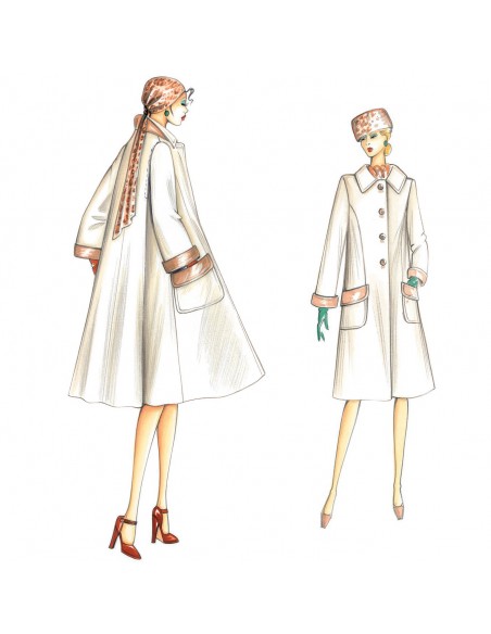 Mantel in A-Linie mit weitem Rücken und loser, außermittiger Falte, Hemdkragen, Umschlagtaschen und Manschetten. Empfohlener Stoff: doppelseitiger Kaschmir, bedruckter Samt oder leichter Baize.