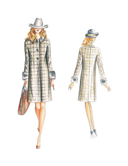 This straight coat has kimono sleeves with triangular insert, tailored shirt collar and inside pockets. Suggested fabric: wool check or mohair.