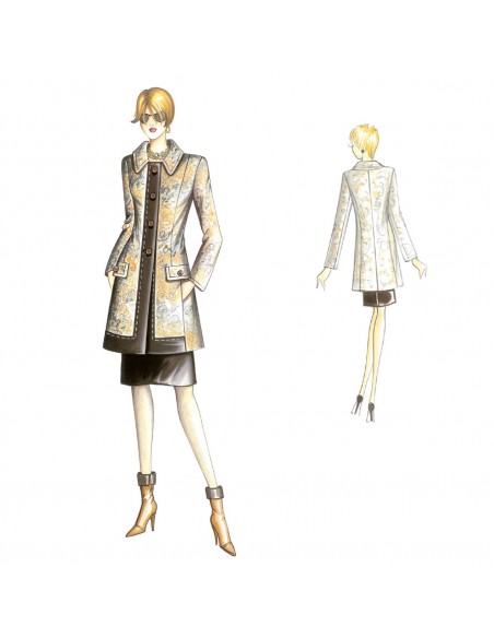 The single-breasted closure of this short redingote is marked with trim in a contrasting color that continues to the hemline. It has vertical inset pockets with horizontal flaps marked with buttons. Suggested fabric: plain fabric or damask with velvet trim.