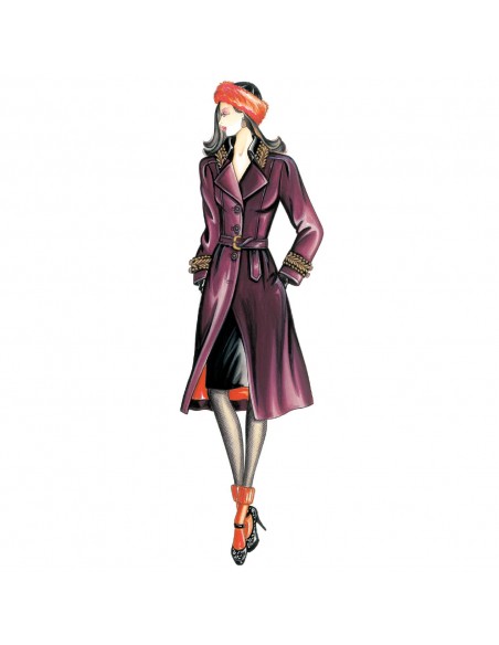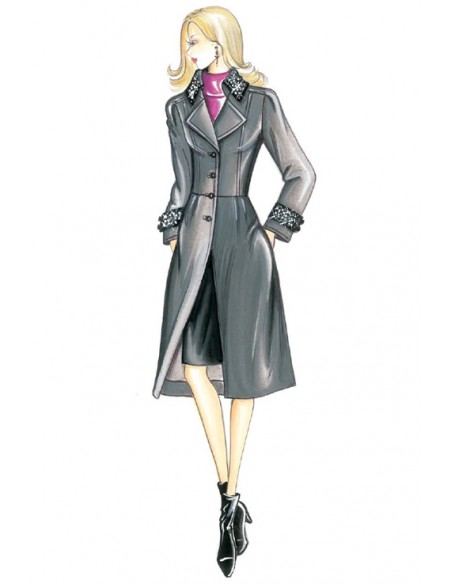This form-fitting coat has a vintage flair with snug waistline and flared hemline. The Danton collar and cuffs are trimmed with braid. It has drop sleeves that are gathered at the shoulders. Suggested fabric: vicuna and velvet.