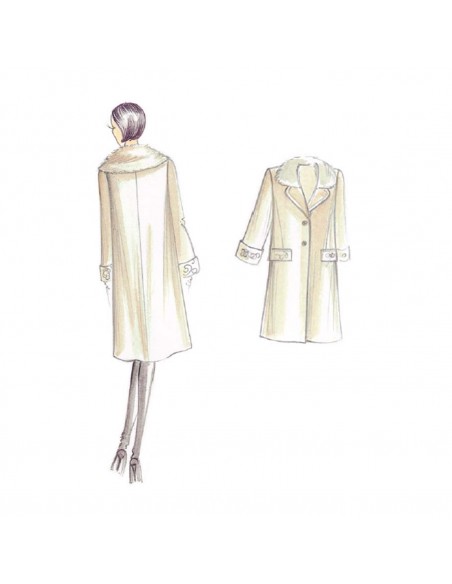 This flared, single-breasted coat has a broad collar with double lapels. The sleeves are set in shirt-like armholes and have turned up cuffs that are embroidered like the flaps. Suggested fabric: plain fabric or velour.