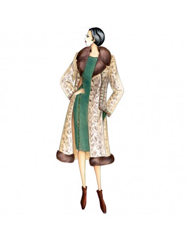 Loose-fitting coat with borders and waistline picked out in leather, braid or grosgrain trim, stand-up collar with rounded lapels, and inset pockets with turnover semi-circular pocket flaps. Suggested fabric: tweed or vicuna.