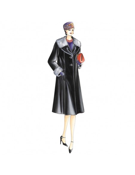 This elegant trapezium-cut coat has a broad shawl-like collar that is soften by gathers and partially trimmed in fur. It has inset pockets with flap set into the cuts. Suggested fabric: vicuna or velour.