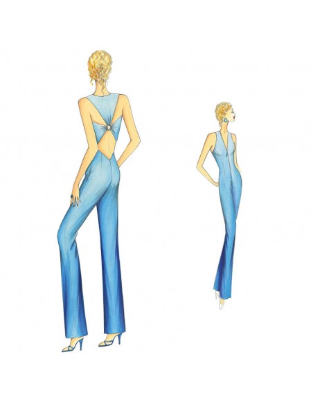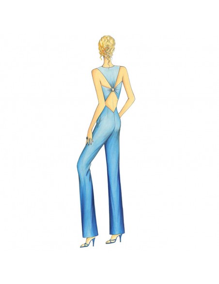 Der Rücken spielt bei diesem Jumpsuit im Stil der 1960er Jahre eine tragende Rolle. Er hat einen zentralen Ring, der das Mieder aus leicht gerafften dreieckigen Paneelen hält, die eine rautenförmige Öffnung lassen. Vorne wird er mit einem Reißverschluss geschlossen. Empfohlener Stoff: Jersey, Crêpe oder Leinen.