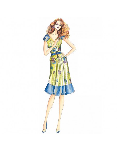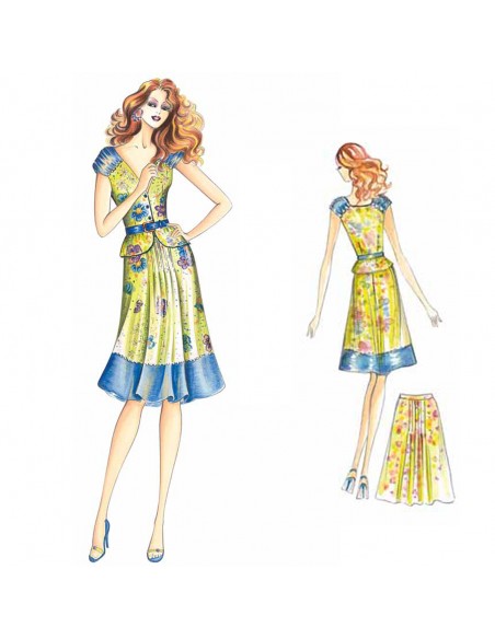 Dieser ausgestellte Bahnenrock hat in der Mitte eine Vielzahl kleiner Falten, die ihm Fülle verleihen. Oberteil n. 1715.