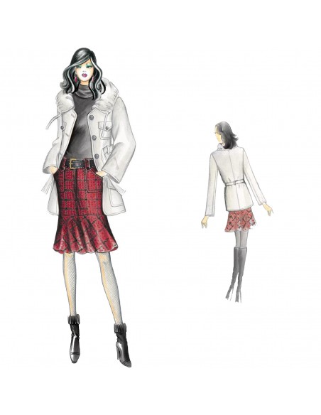 Dieser gerade Rock hat eine breite Volantrüsche, die unten schräg geschnitten ist, und aufgesetzte Taschen, die so verlängert sind, dass Gürtelschlaufen entstehen. Jacke n. 1023.