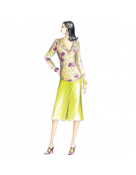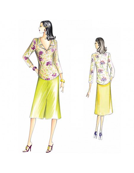 Dieser lange, ausgestellte Rock hat einen Mittelschlitz. Empfohlener Stoff: Denim, Gabardine, Crêpe. Bluse n. 1684.