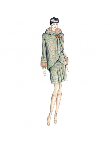 Dieser Minirock hat ein britisches Flair mit drei zentralen Falten auf der Vorderseite und Taschen mit dreieckigen, abgesteppten Klappen, die mit Knöpfen geschlossen werden. Empfohlener Stoff: Tweed, Tartan, Prince of Wales-Karo, Hahnentrittmuster, Gabardine. Jacke Nr. 2563.