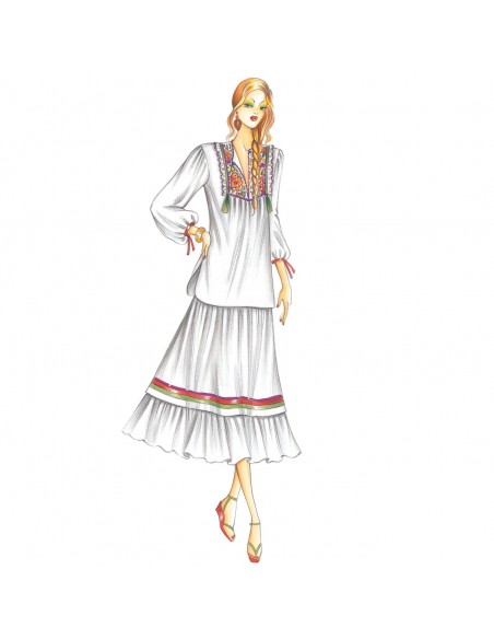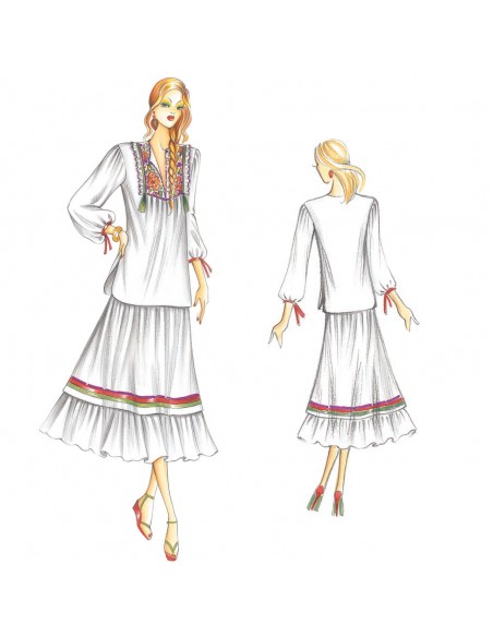 Locker geraffter Rock mit farbigen Seidenborten und Volants. Bluse n. 3134.