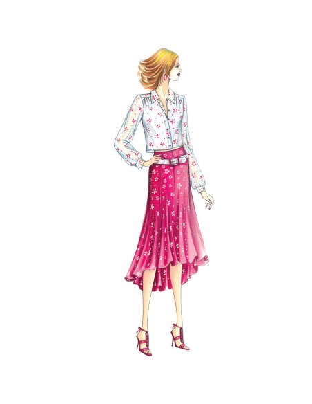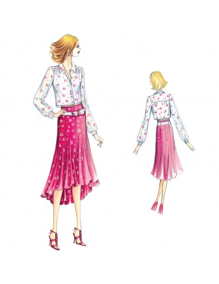 Dieser Rock wird durch die schräg geschnittenen Stoffbahnen breiter und der Saum fällt hinten nach unten. Empfohlener Stoff: Musselin oder Baumwolljersey. Hemd Nr. 5238.