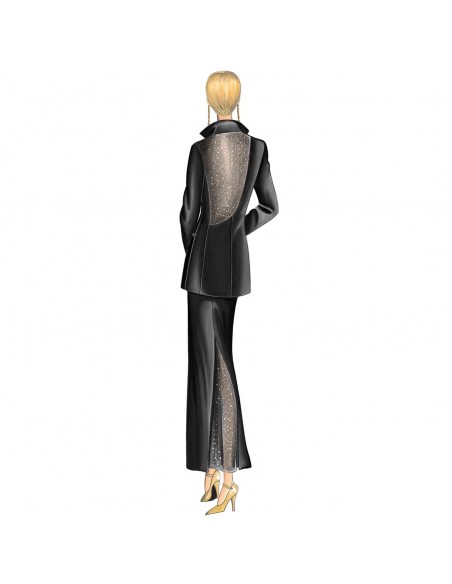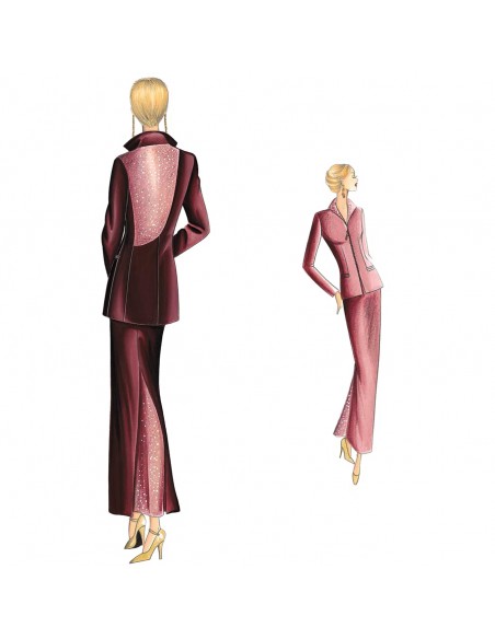 Dieser lange, gerade Rock hat einen tiefen Schlitz am Rücken. In den Schlitz ist ein ätherischer Chiffonkeil eingesetzt. Empfohlener Stoff: Crêpe, Charmeuse-Satin, Cady oder Samt. Jacke n. 8937.