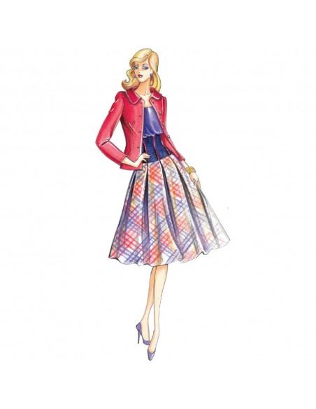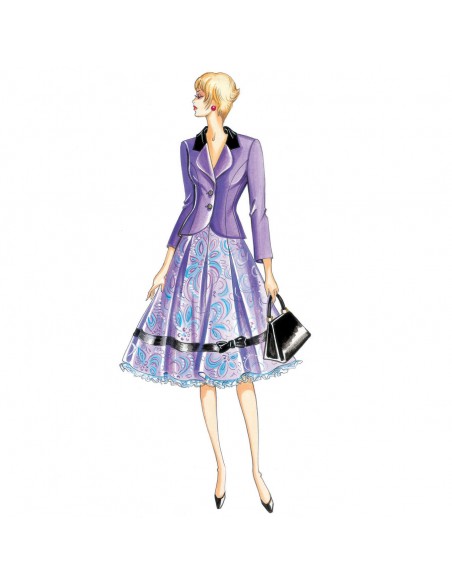 Dieser Rock ist von den 1950er Jahren inspiriert. Er hat eine elastische Korsett-Taille und der Rock hat Kellerfalten. Empfohlener Stoff: Madras, auf der Schräge geschnitten. Kann mit einer Jacke mit tailliertem Schnitt und Babykragen n. 1999 getragen werden.