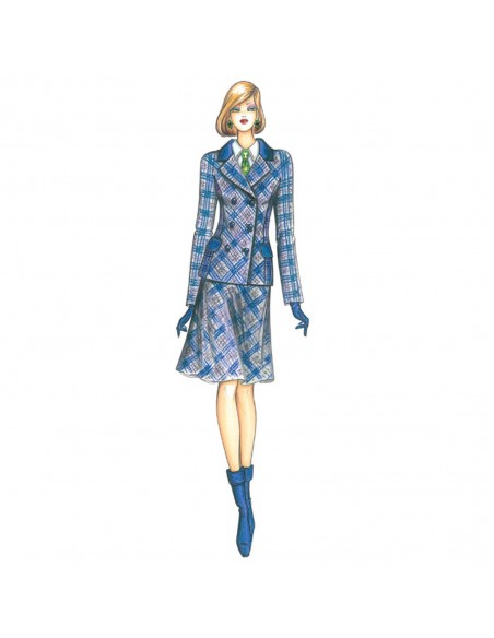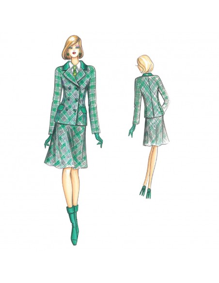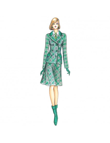 Knielanger Godet-Rock ohne Schärpe, empfohlener Stoff: Schottenstoff, Tweed, Crêpe oder Samt. Jacke 3504.