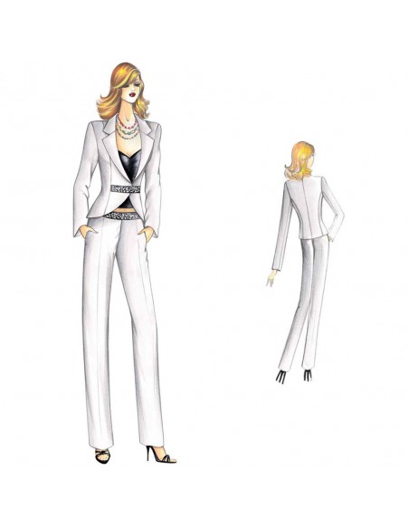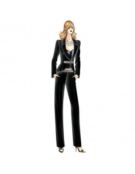 Diese kurze, eng anliegende Jacke ist raffiniert und trendy. Sie wird in der Taille mit einem Gürtel oder einem einzigen Knopf geschlossen und hat einen Kragen mit versetztem Revers, der einen tiefen Ausschnitt bildet. Der untere Saum ist abgerundet. Hose n. 0236.