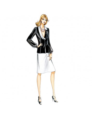 Diese etwas locker sitzende Bluse hat eine leichte Raffung in der Passe und eine Zierleiste, die um den herzförmigen Ausschnitt verläuft. Sie wird einreihig geschlossen und hat ¾-Ärmel, die an den Manschetten gerafft sind. Empfohlener Stoff: Jersey-Jacquard oder Lurex, Crêpe de Chine, Satin. Rock n. 0460.