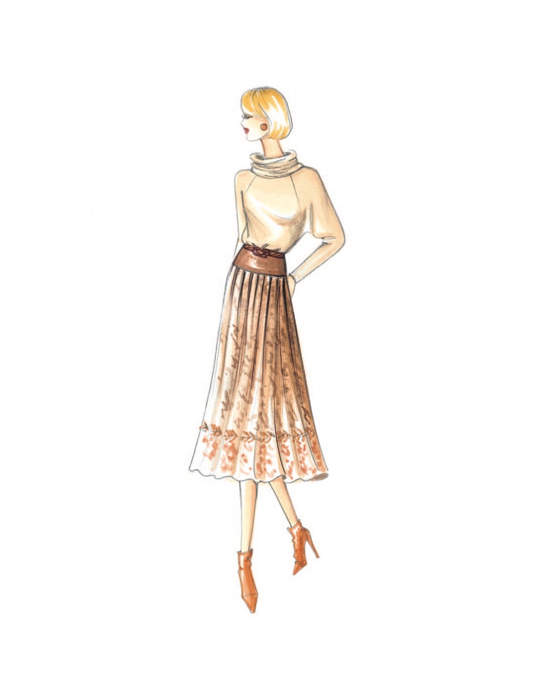 Dieser Rock im Ethno-Stil wird durch lockere Falten aufgelockert. Bluse n. 2904.