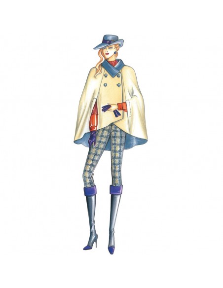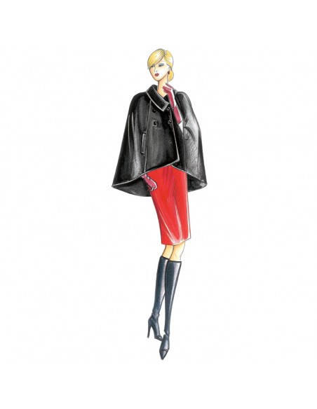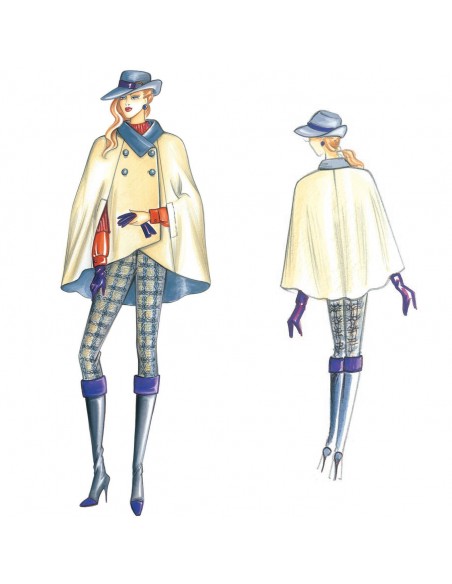 Umhang mit doppelreihigem Verschluss, spitzem Umlegekragen und Schlitzen auf der trapezförmigen Linie. Empfohlener Stoff: Doppeljersey, reversible Wolle oder Mohair. Leggings n. 3241.
