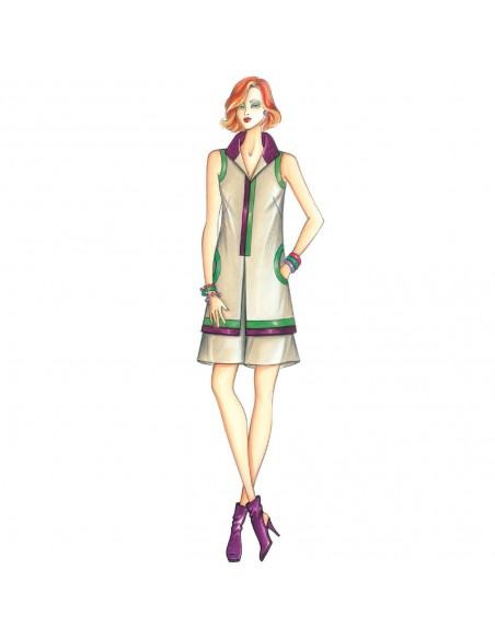 Langer ärmelloser Kasack in ausgestellter Linie, mit Polokragen, mittlerem Schlitz und abgerundeten Innentaschen. Ausführbar in Baumwolle oder Piquet mit Gros-Grain-Säumen in Kontrastfarben.