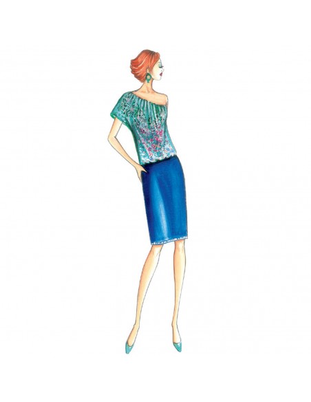 Einschultriges Blusen-Top mit Kräuselung längs des Ausschnitts und kurzer einzelner Kimonoärmel. Ausführbar in Chiffon, Jersey, Musselin.