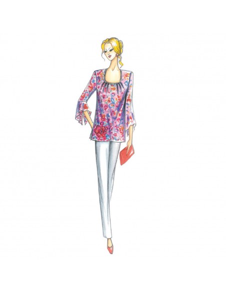 Kasack in ausgestellter Linie, ausführbar sowohl als Bluse mit Schnur am Ende als auch lose, ¾ Ärmel, Manschette mit offenem Volant. Empfohlene Stoffe: Jersey, Chiffon oder Musselin. Das Schnittmuster enthält Anweisungen auf Deutsch.