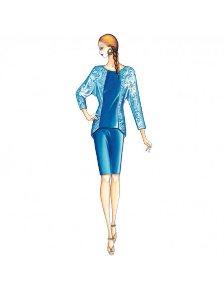 Kimono-Bluse in modellierter Linie an der Seite, mit am Rücken ablaufendem Saum, abgerundeter Ausschnitt und vertikale Schnitte, die eine Ausführung in zwei Textilien oder verschiedenen Farben erlauben. Ausführbar in Jersey, Crepe de Chine, Voile.