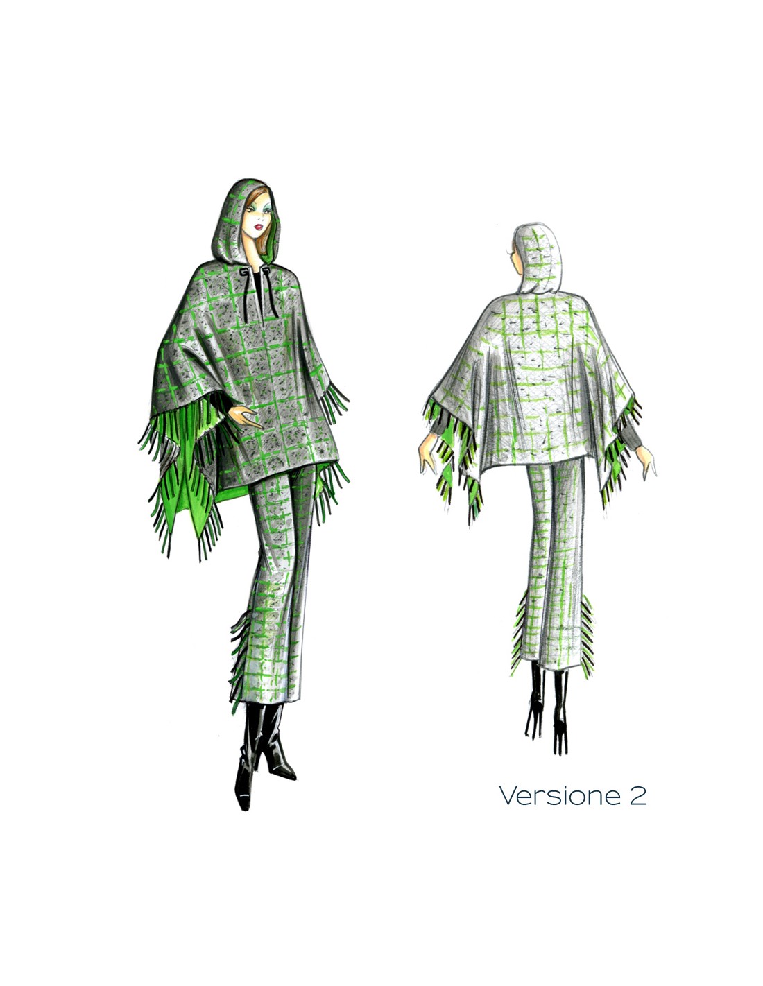 Weiter Mantel-Poncho, ausführbar in drei Versionen: vorne geschlossen mit Polo-Öffnung und Kapuze oder mit einfachem Rundausschnitt, Bord-an-Bord-Reißverschluss und hoher Saum am Ende in Kontrastfarbe. Die dritte Version sieht einen verkürzten Ärmel vor, Polo-Reißverschluss und applizierte Taschen. Ausführbar in Stoff, Plaid-Textil, Double-Face-Kaschmir.
