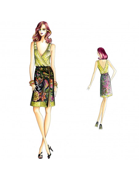 Leicht ausgestellter Rock mit geformter Schärpe und seitlichem Reißverschluss. Oberteil n. 6845.