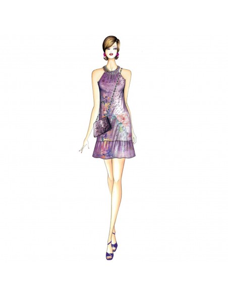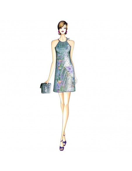 Leicht ausgestelltes Minikleid mit steinbesticktem Rundhalsausschnitt, der mit Raffungen und einem Revers im amerikanischen Stil versehen ist. Durch seine Vielseitigkeit ist er praktisch und elegant zugleich und eignet sich für viele Gelegenheiten. Es kann auch mit einem Schleifenausschnitt gefertigt werden. Empfohlene Stoffe: Jersey, Chiffon, Satin oder Viskose.