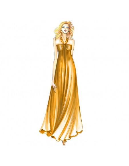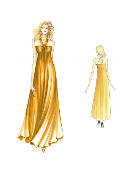 Empire-Sonnenkleid mit eng anliegendem Dekolleté-Mieder, das durch einen geknoteten Träger im Nacken gehalten wird, und langem, ausgestelltem Rock, der durch Raffungen bewegt wird. Aus Jersey oder Stretchmaterial.